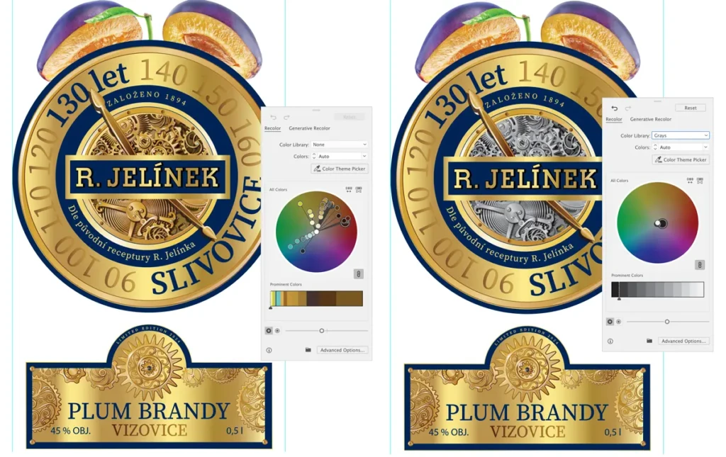 Funkce Recolor umožňuje rychle přebarvit vektorové objekty složené z mnoha barev.