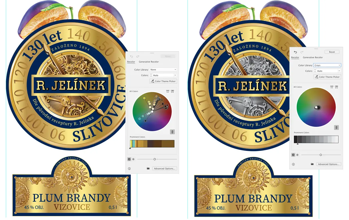 Když budeme chtít například vnitřek hodiny změnit ze zlaté na černobílou, jde to samozřejmě i ručně. Jenže to znamená projít všechny objekty a barvy. Pomocí Recolor stačí kliknout na Color Library / Swatch Group a vybrat vhodnou paletu.