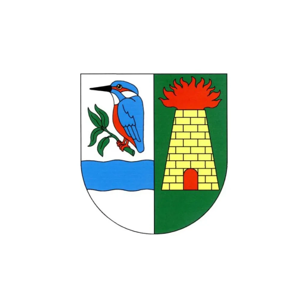 Ve stříbrno-zeleně polceném štítě vpravo nad sníženým modrým vlnitým břevnem ledňáček říční přirozené barvy sedící na zelené vrbové větvi se čtyřmi listy, vlevo zlatá kvádrovaná červeně hořící vysoká pec s červeným topeništěm. (zdroj: psp.cz)