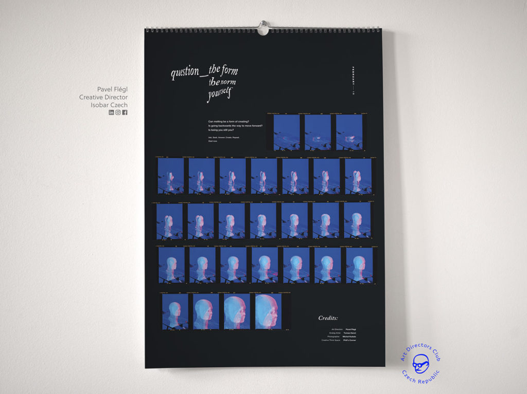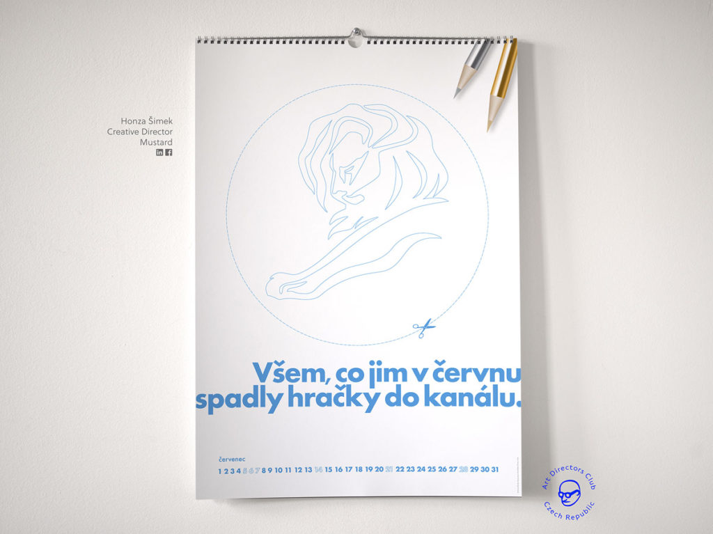 „Kalendář prezentuje nápady dvanácti členů Art Directors Clubu. Všichni dostali stejný úkol: kreativně zpracovat příslušný měsíc, který jim byl vylosován. Zadání nesvazovalo žádné společné téma, každý z přihlášených mohl vytvořit list kalendáře podle svého.“