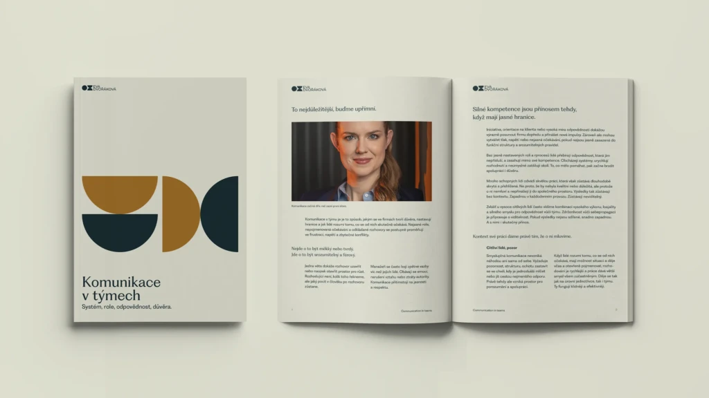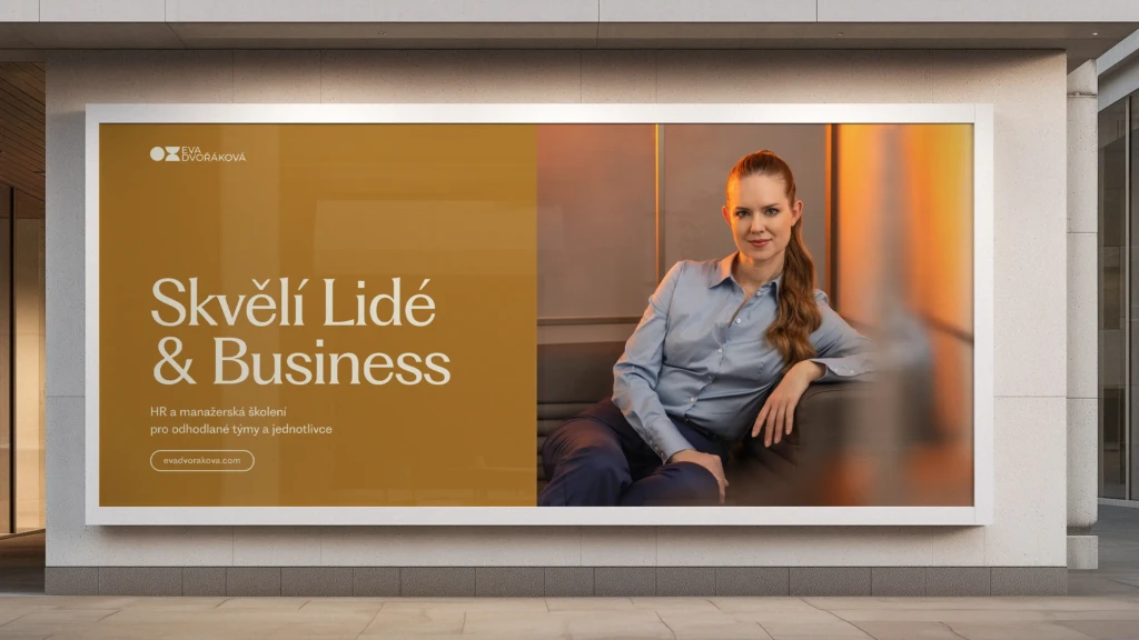 „Vizuální styl, web i celková komunikace mají jasný cíl: odlišit Evu od konkurence a už na první pohled ji pozicovat jako výjimečnou profesionálku, kterou je. Velký důraz byl kladen na funkční kompozice, práci s white space a fotografii. Základem je minimalistické logo, symbolizující vztah dvou entit. Jedna školí a doprovází, druhá se díky ní transformuje. Logo je zároveň nejjednodušším možným zobrazením jména „Eva“ pomocí kruhů.