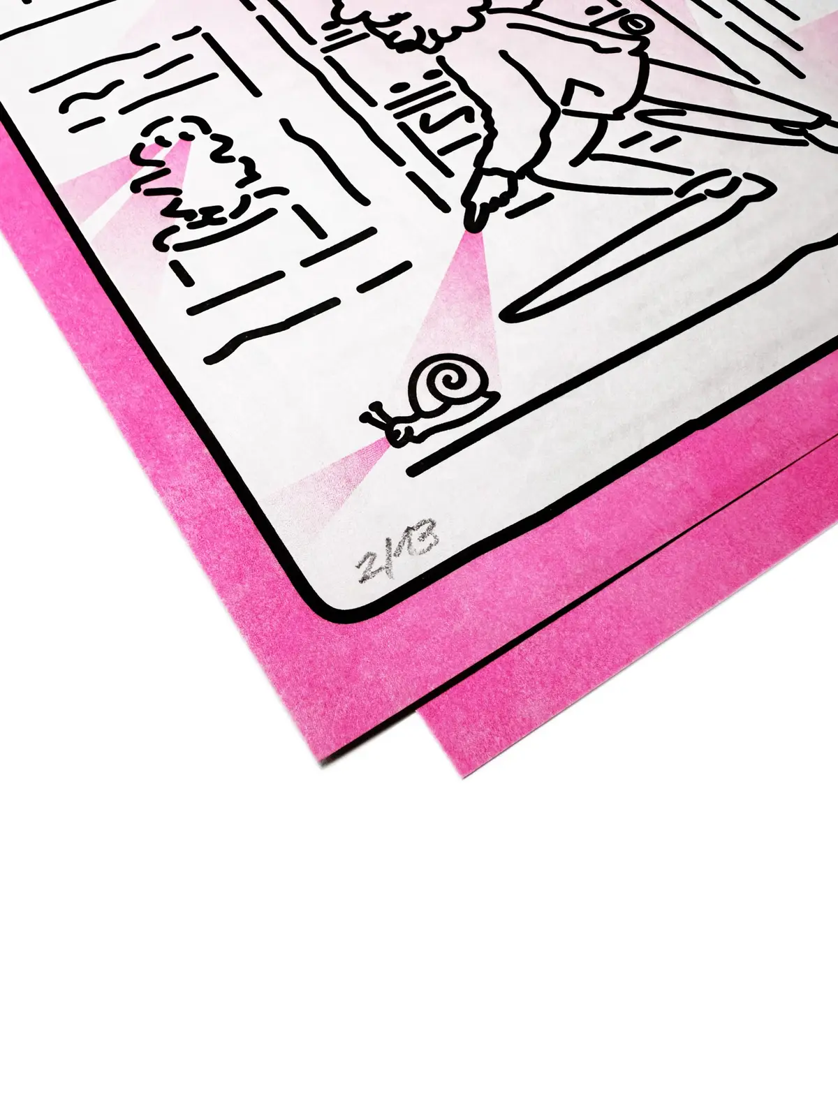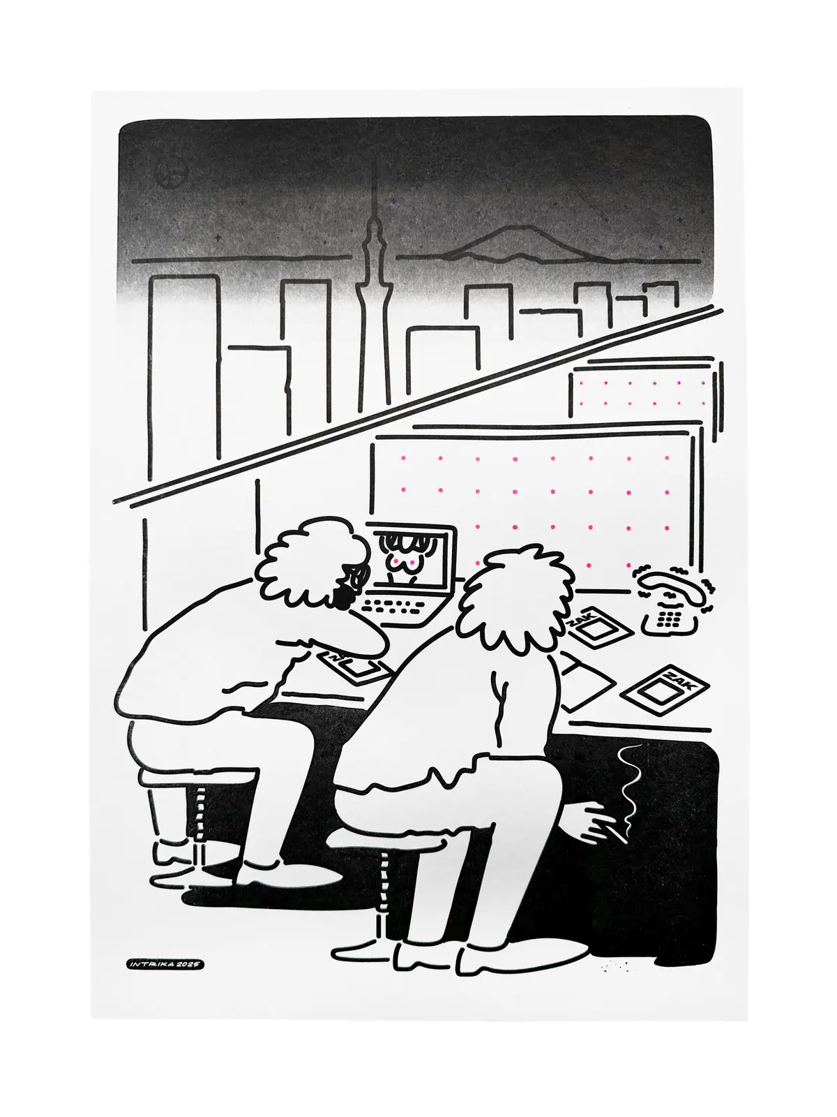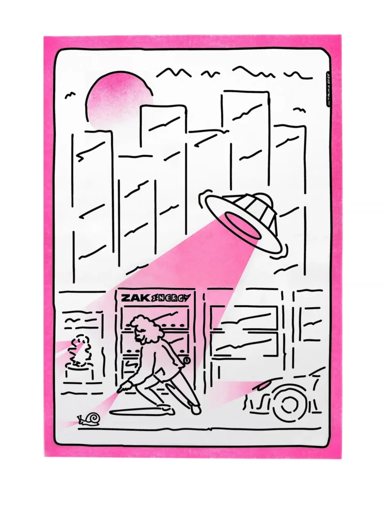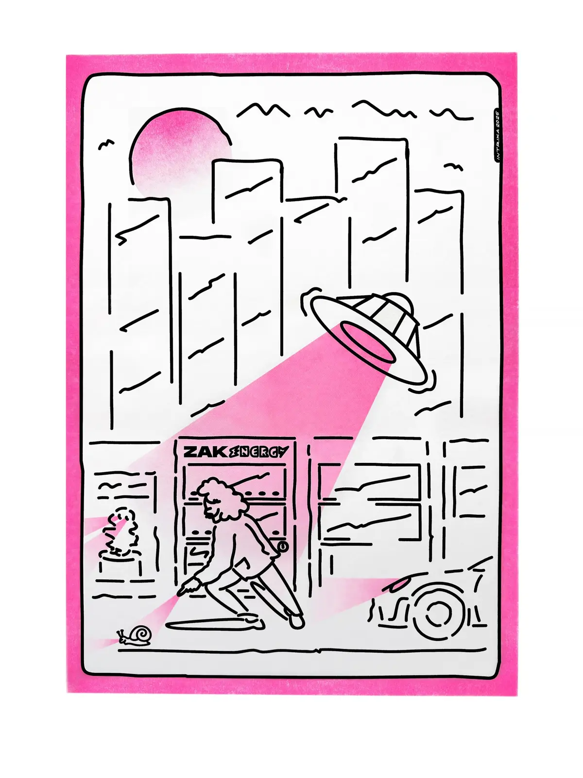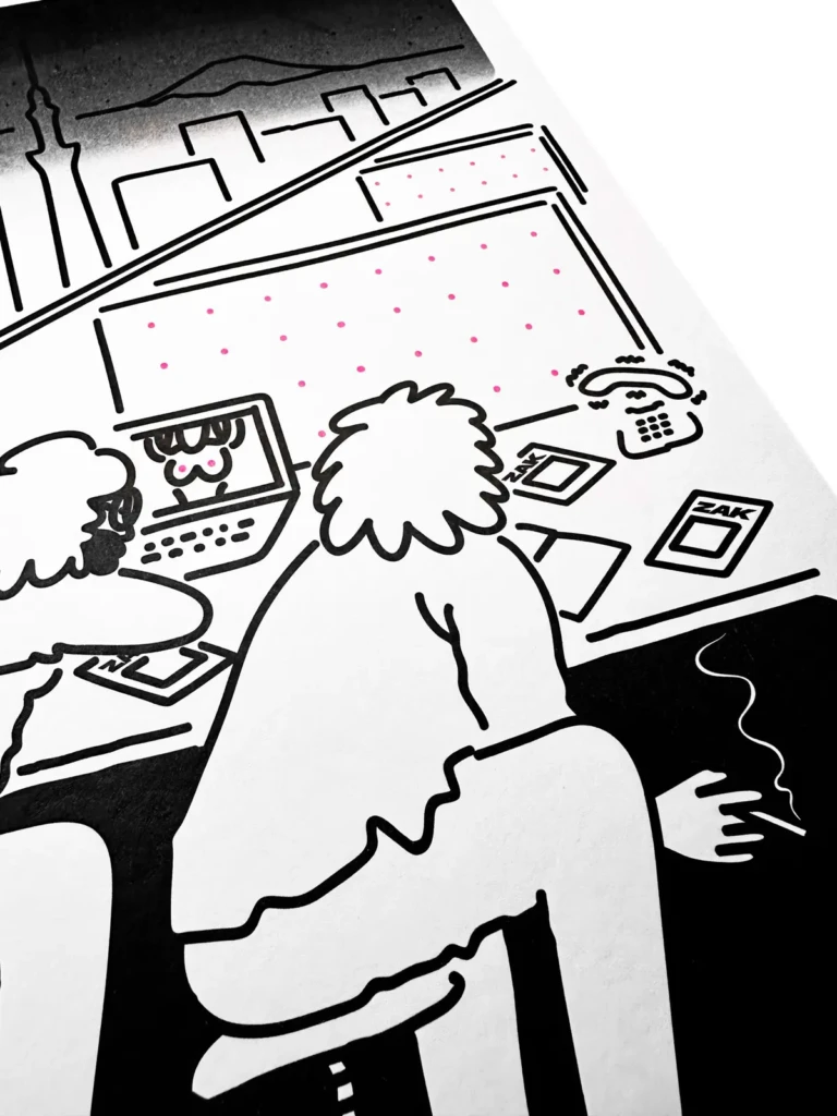 Výchozím bodem jsou fotografie, které redukuji na esenciální linie a přetvářím skrze vizuální jazyk ZAKu s nadsázkou a jemným humorem. Výsledkem jsou monochromatické riso tisky s akcenty neonově růžové nebo dalších barev, vždy v limitované edici 10–15 kusů se speciálním Certificate of Creation.